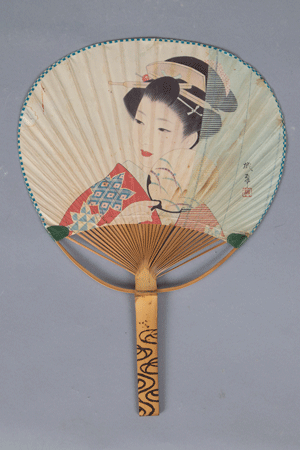This fixed advertising fan, a recent donation, has a bamboo handle and sticks as well as a double-sided paper leaf depicting an image of a Japanese geisha. Advertising fans featuring goods and services gained prominence during the 1920s, establishing a trend that continues to this day. The donor received this hand fan at Sakura-bana, a Japanese Restaurant on Broad Street in Boston, while on a visit from Puerto Rico in 1976.