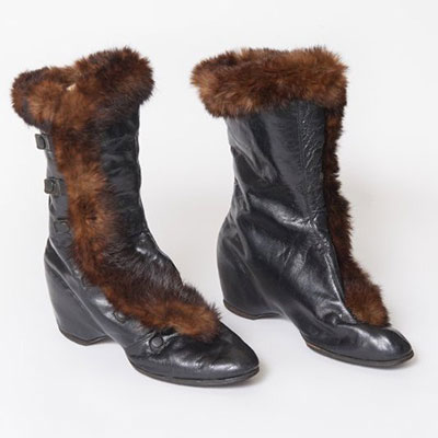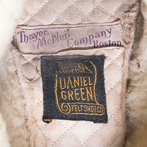 A variety of materials were used in boot construction including rubber, leather and fur. Side snaps created easy and wearable closures for fit and practicality. This particular pair of boots includes two labels; The Thayer McNeil Company and The Daniel Green Felt Shoe Company. The Thayer McNeil Company of Boston was established in 1860 and closed after one hundred years in business. The Daniel Green Felt Shoe Company was established in Canastota, New York in 1882, and eventually the business moved to Utica, and then New York City. The primary products were felt inserts for footwear, for both comfort and warmth. Throughout their combined histories, these companies pioneered many stylistic and functional changes in footwear. One can see from this fine example of lady's carriage boots that the focus centered on both quality and artistry. Certainly, the wedge heel and rubber, leather and fur combination are timeless.