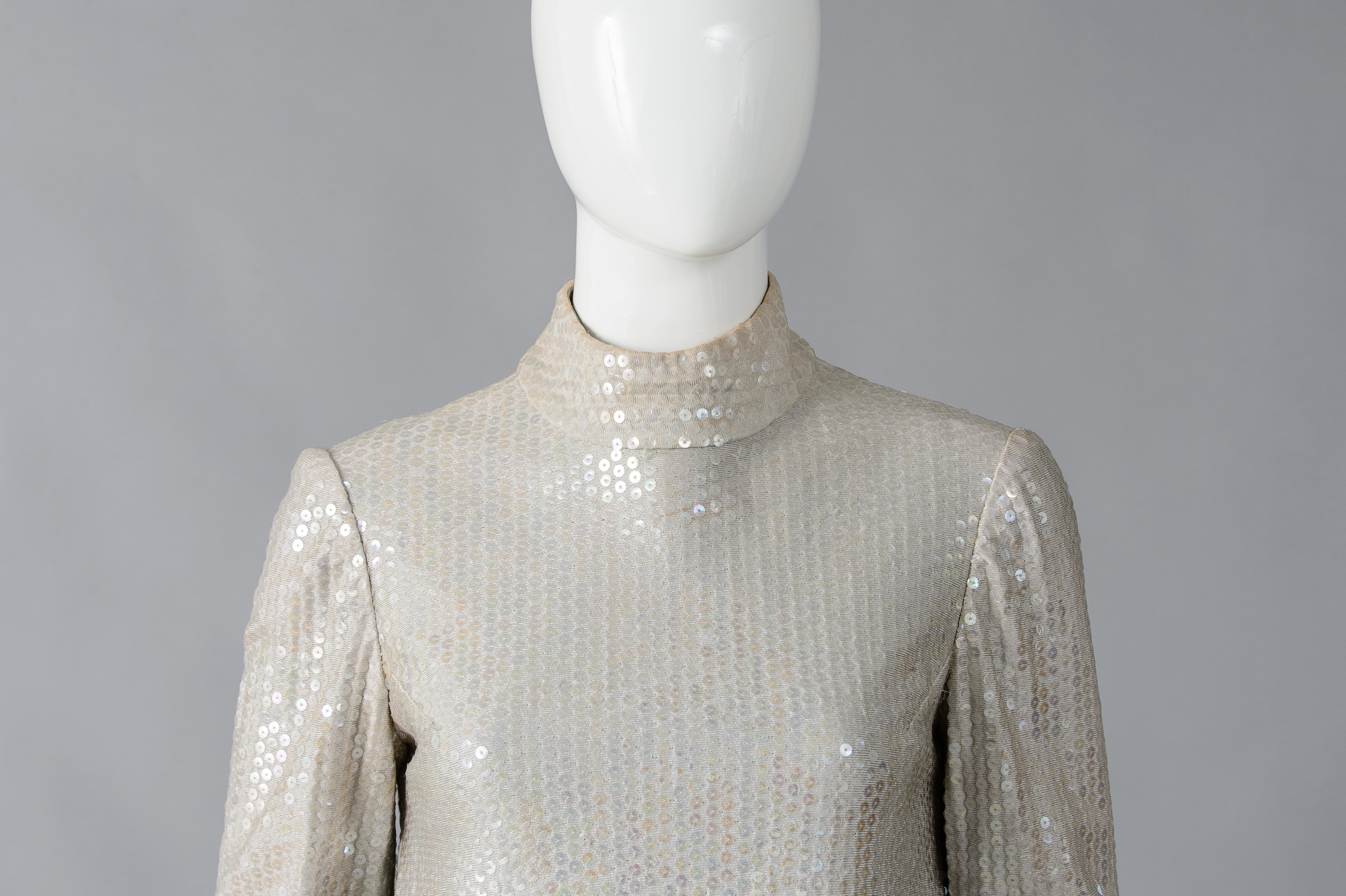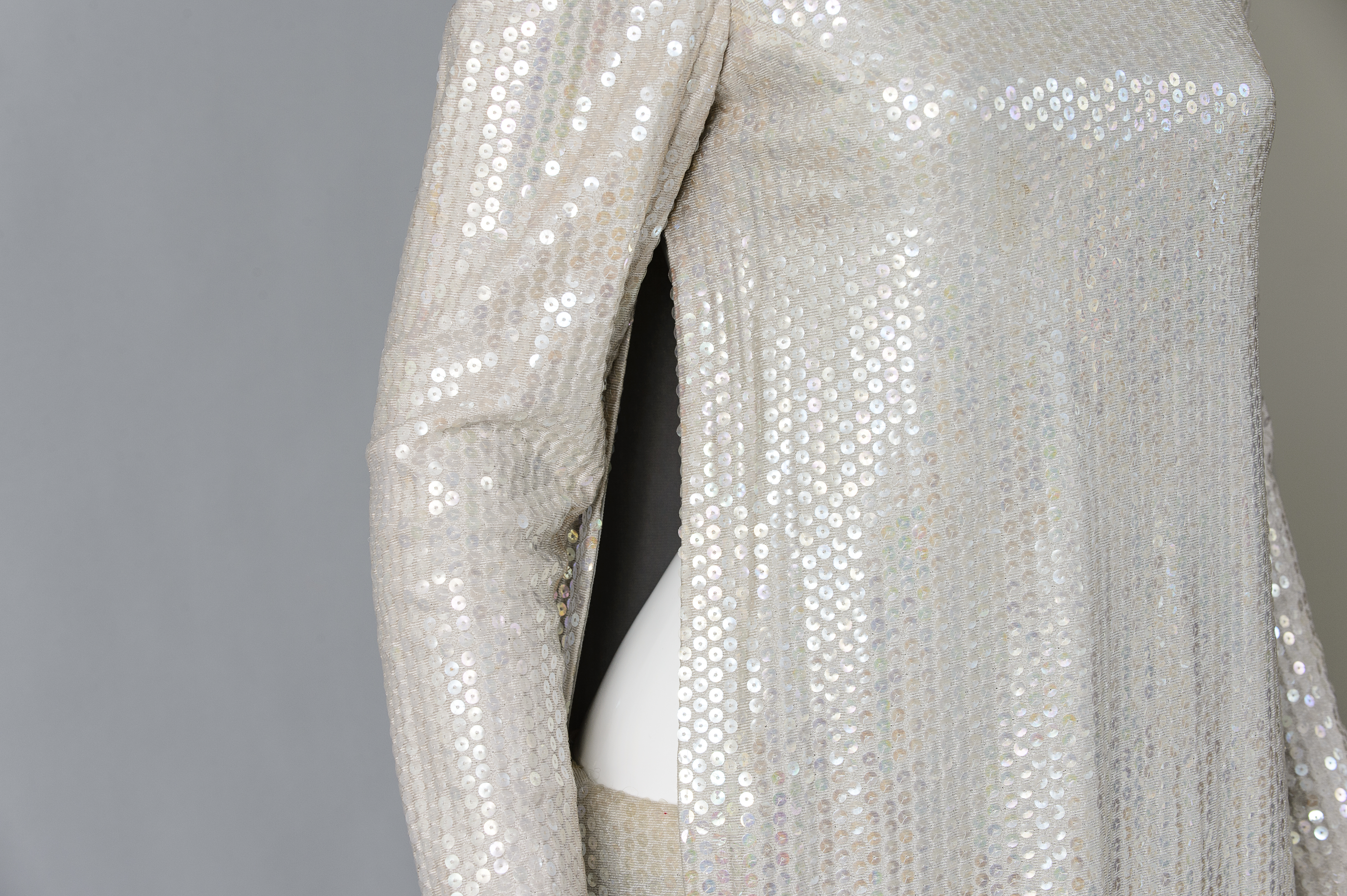 Pantsuit; two-piece, made of pale grey jersey covered completely with "sequins-by-the-yard" (flat, clear iridescent plastic pailletes held together with a clear nylon thread). Ankle-length tunic top (A) has a 2-inch wide stand-up collar, and long, set-in sleeves. Completely open at the sides from just below the bustline to the ankle. Top is fully lined with a grey polyester tricot knit lining. A pale grey nylon zipper closes the tunic at center back. Two silvertone metal hooks are sewn at proper left center back collar with corresponding thread loops at proper right. Matching bell-bottom pants (B) have a slightly dropped waistline and are lined with the same grey tricot knit lining. A pale grey nylon zipper is sewn in a placket at center back waistline.