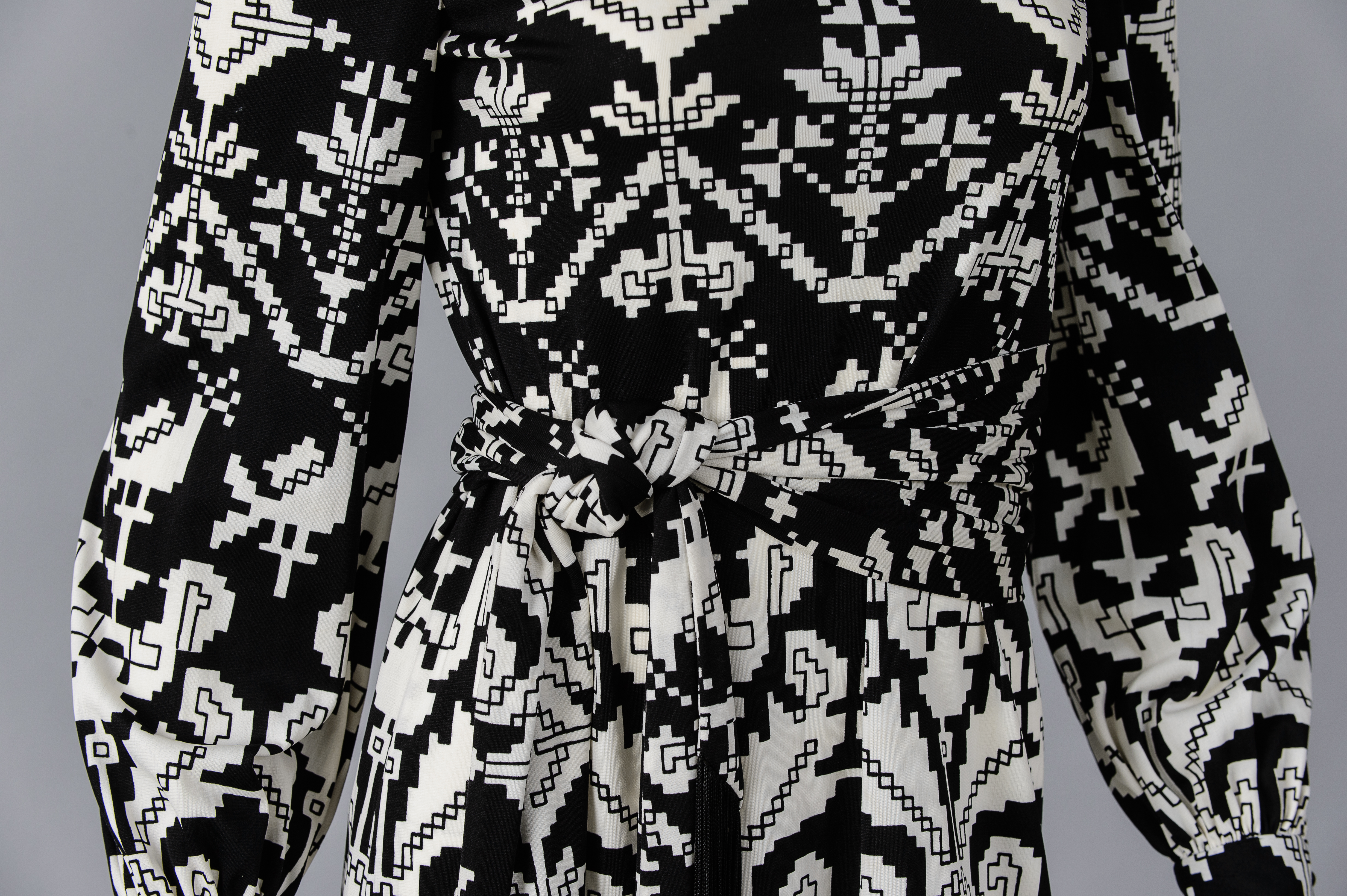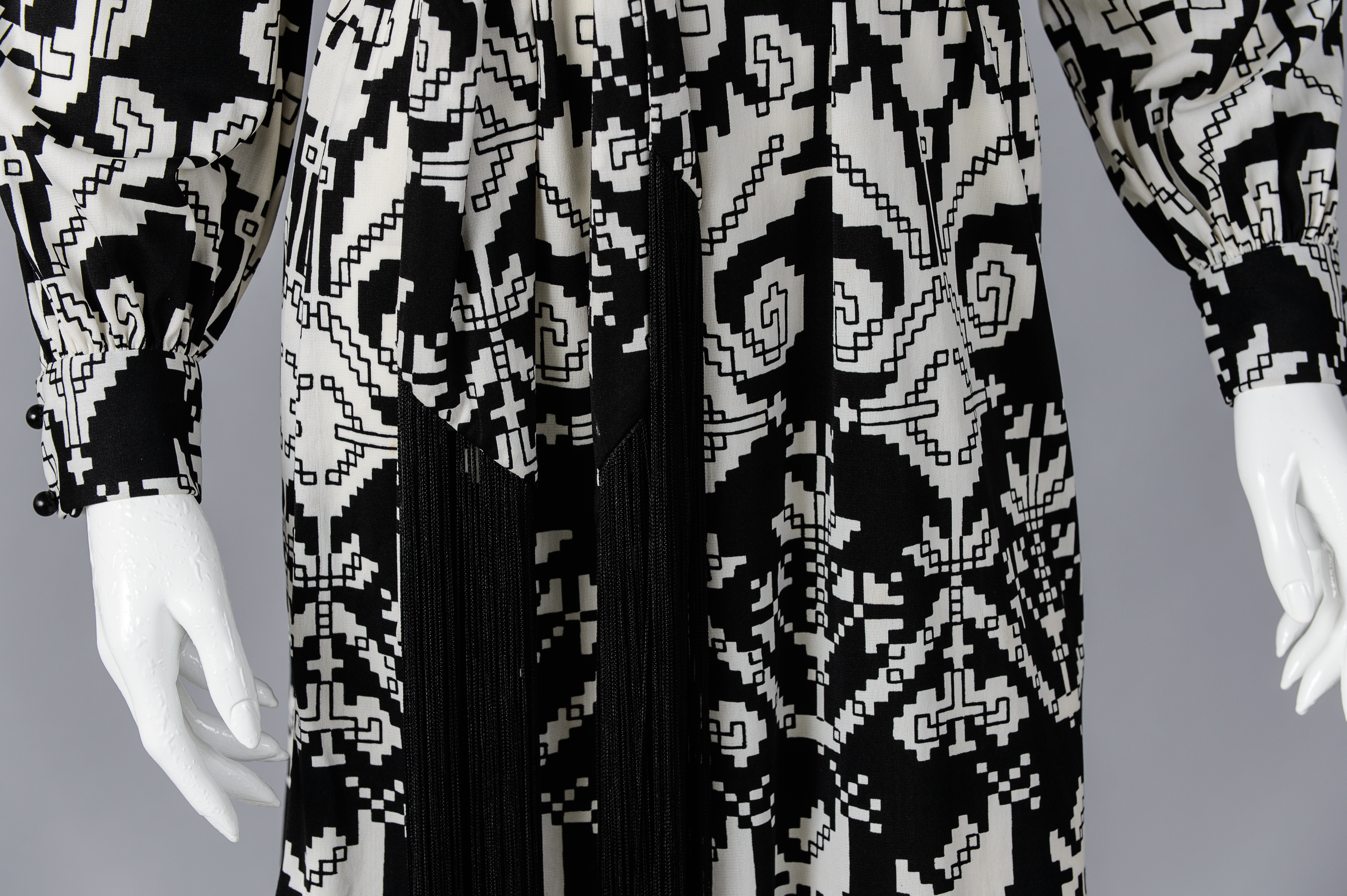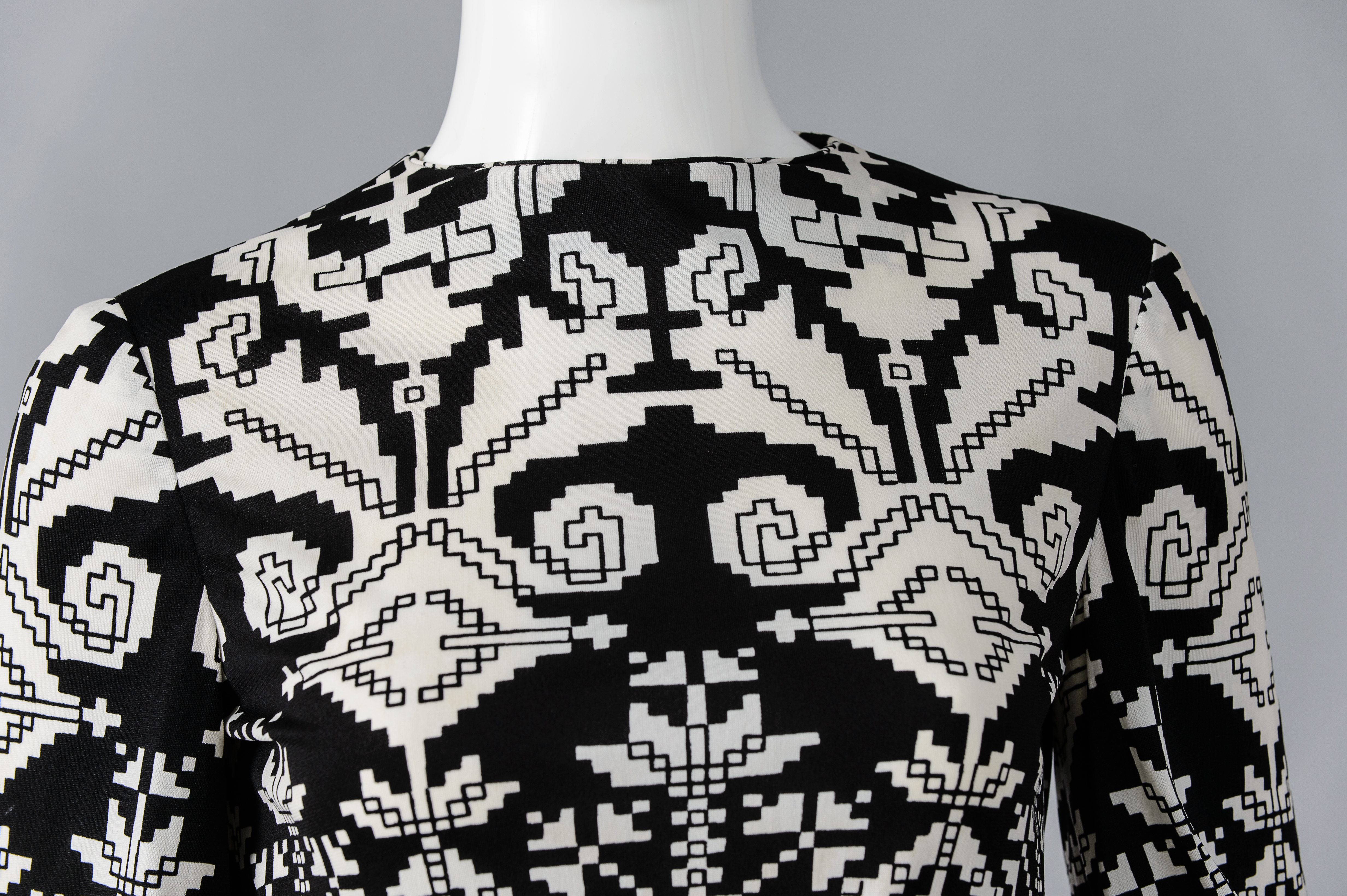 Dress; Polyester knit in a black and white geometric print mini dress (A) with an A-line silhouette. Dress has a jewel neckline with self-fabric facing. Long, set-in sleeves are gathered into 2-inch wide cuffs at wrists, each fastened with two snaps covered with black fabric. Decorative black ball buttons are sewn to the cuffs over the snaps. There is a black nylon zipper at center back, and a black metal hook and eye fastener at center back neck edge. Belt or scarf (B), made of the same fabric, is 60 inches long, excluding a deep (18 inch) black fringe at each end.