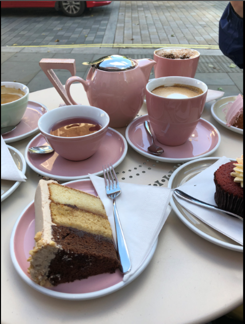 After seeing the State Rooms, my friends and I did what any tourist would do- we went to the gift shop. As the Queen loves her corgis it was only right for me to spend £20 on a stuffed corgi plush. Afterwards with all of our gifts in hand, my friends and I walked a few blocks away to a popular tea and cake shop called Peggy Porschen Cakes. This particular bakery had become Instagram famous for its beautiful outside decorations, known for changing them every season or holiday. Additionally, everything was pink, the building, the tea cups, and most of the food. My friend and I had shared a pot of the Orange Flower tea. I also ordered a piece of the Salted Caramel cake. The food and drinks were delicious! And the Instagram worthy- pictures never stopped. All in all, it was a very royal experience touring my future home and enjoying some warm tea on a chilly day.