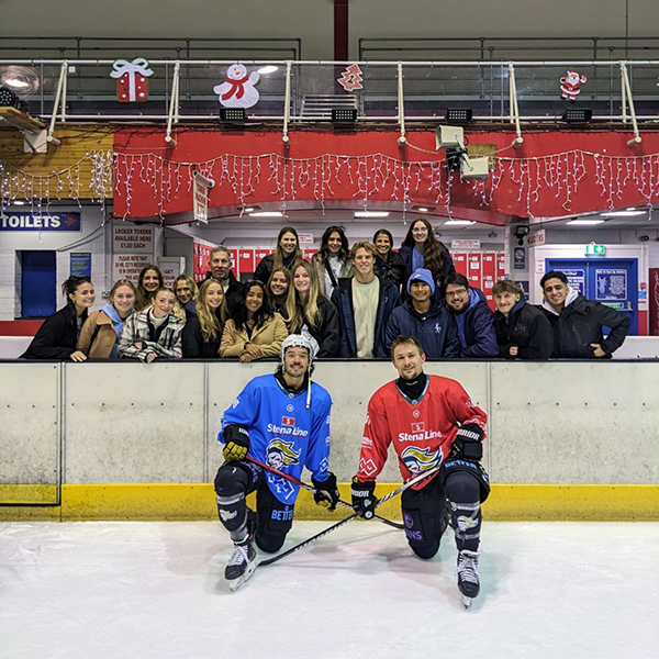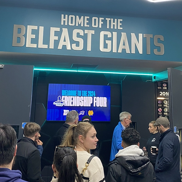 Students enrolled in this 3-credit course travel to Belfast, Northern Ireland during Thanksgiving break for experiential learning at the Friendship Four Hockey Tournament, in collaboration with the Belfast Giants professional hockey team and Ulster University.
