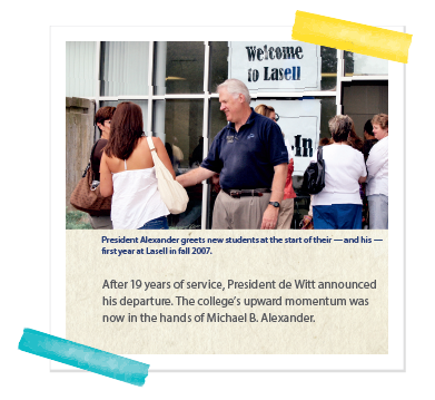 President Michael B. Alexander: I had always wanted to be a small-college president. When the opportunity arose and I did the research, it became apparent to me that Lasell had a lot going for it that wasn't necessarily recognized by public perception. Under Tom's leadership, the school had stabilized. I felt that it was poised to leap forward with the courage to make investments and take risks ... and so we did.