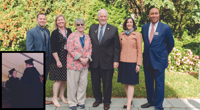 Pictured above L to R: Matthew Reilly '06 G'09, dean of the Michael Longe '95 School of Business; Chelsea Gwyther, vice president of university advancement; donor Barbara Longe P'95; President Michael B. Alexander; Newton Mayor Ruthanne Fuller; and Provost Eric Turner at the Longe School dedication. Inset: Michal Longe at her Lasell graduation.