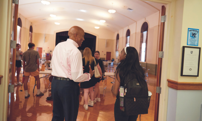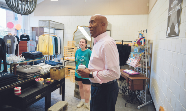 Eric Turner invites a colleague into the president’s office in Brennan Library with a wide smile and outstretched hand. He settles into his desk chair and glances toward his computer to check for messages.