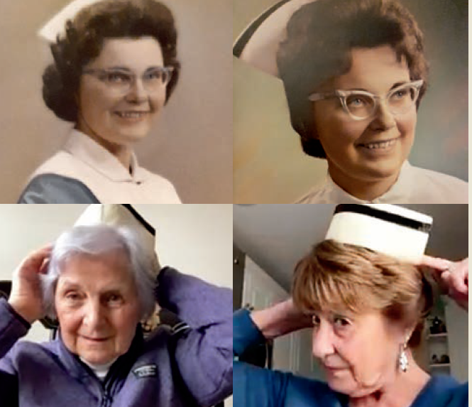 A group of nine graduates of Lasell’s nursing program who continue to meet on Zoom enjoyed a recent discussion about the evolution of nursing caps. The nurses recalled their stiffly laundered caps and how difficult it was to push the buttons in to shape the cap. The caps originated in the early Christian era as a head covering for deaconesses or nuns who cared for the sick. Nursing schools had specific caps for their students; Lasell’s featured a light blue velvet stripe attached for each year completed. At graduation, the blue stripes were replaced by one black velvet stripe. Pictured above top row: Joan Snipes Bigelow as a student. Bottom row: Marsha Graziano Ballantyne and Dee Dee Hanley McGrath modeling their nursing caps today.