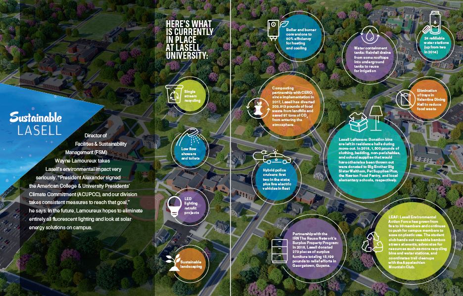 - Composting partnership with CERO: Since implementation in 2017, Lasell has diverted 203,913 pounds of waste from landfills and saved 97 tons of CO2 from entering the atmosphere.