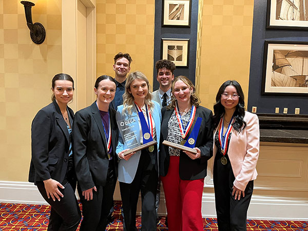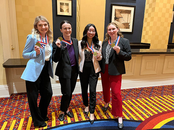 Jillian Nangle ’24 and Meaghan Csongor ’24 each received third-place awards in the Travel & Tourism and Entrepreneurship: Starting a Business categories, respectively. Victoria Savluk ’23 placed in the Top 10 in Financial Accounting, as did Kim Nguyen ’24 in Fashion Merchandising & Marketing. Teammates Spencer Villinski ’25, Charles Anderson ’24, and Bianca Almeida ’25 all had strong showings in the Human Resource Management category, with Anderson earning a medal for his performance on the human resources exam.