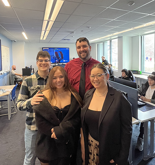 L to R:Dom DeSantis '23, Esports Club President; Cheridan Agnew '23; Vincent Carrabino '22; Professor and Program Director Christina Alejandre
