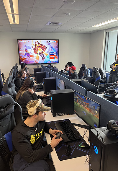 The lab features Lenovo Legion gaming PCs, Corsair T2 Road Warrior gaming chairs, gaming mice and keyboards, gaming consoles and controllers, and high-speed internet. Students in the Esports major and minor, as well as members of the Esports Club, are currently playing Overwatch, CSGO, Valorant, Rocket League, and Super Smash Brothers, with the hopes to expanding to FIFA, Rainbox 6 Siege, and others.