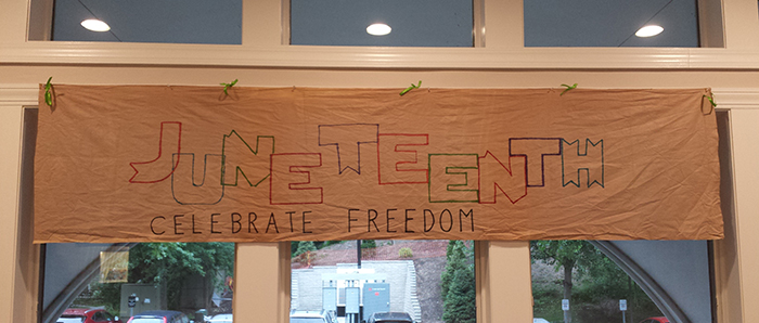 Juneteenth banner created by Lasell Villagers Rita Martin, Jean Stringham, and Caroline Schastny