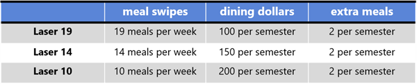 The Laser 19 consists of 19 meal swipes to be used at Valentine Dining Hall (three (3) of which can be used at 1851 Late Night weekly), 100 Dining Dollars to be used just like cash on a debit card at any on-campus dining location, and two extra meals for use at Valentine.